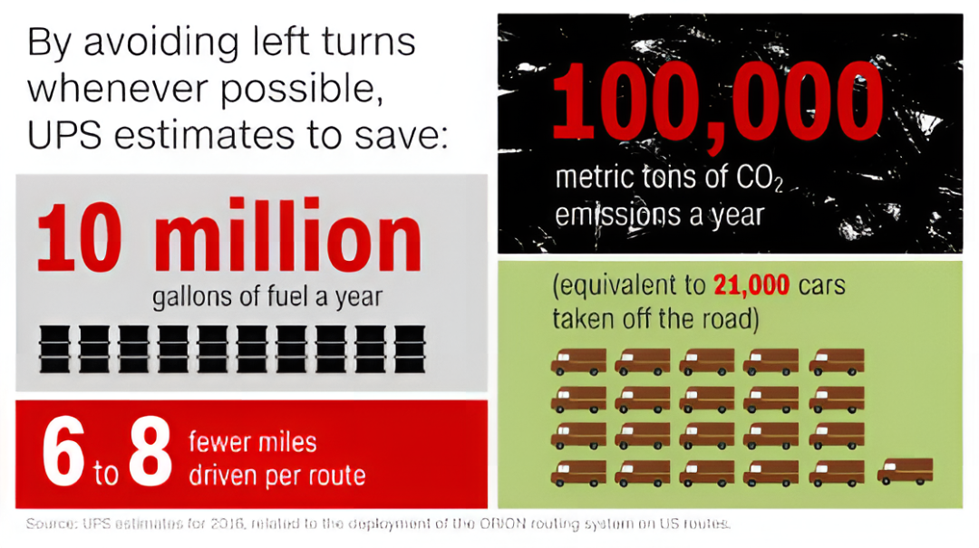 冷知识:UPS的算法会优先选择“右转路线”,因为左转需要等待交通灯,耗时更长——仅靠优化路线,UPS每年能省下数百万加仑燃油!