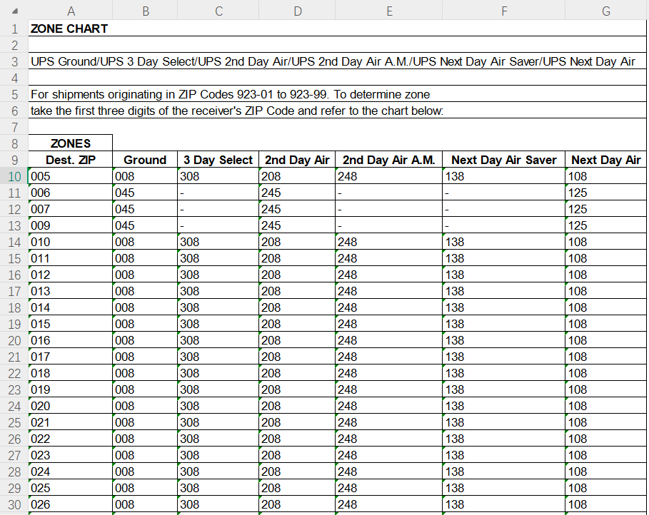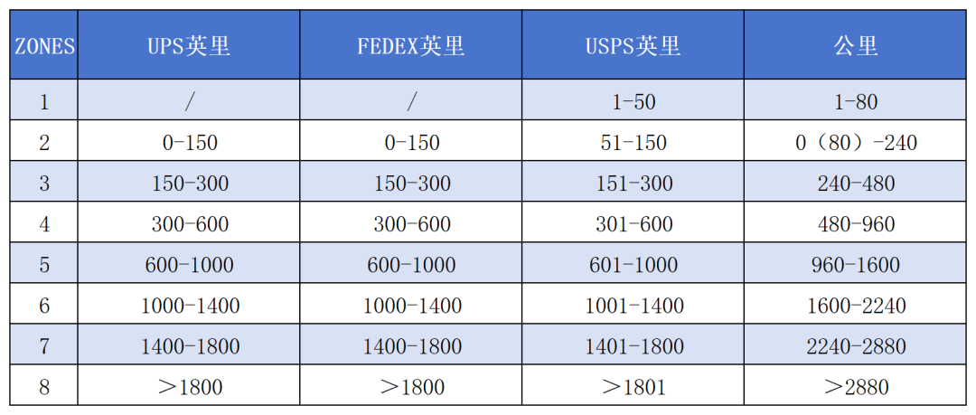 简单来说,美国三大快递公司(FedEx、UPS、USPS)根据寄件地址和目的地直线距离,将整个美国48个州划分成多个区域(通常是2-8区),划进了分区定价体系里。