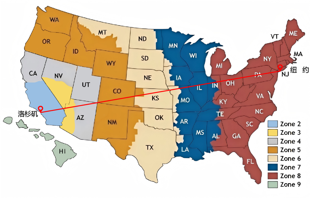 而若是你的货物从洛杉矶→纽约,两地距离超过1800英里,那么在分区上属于ZONE 8,两地横跨了整个美国,所以昂贵。