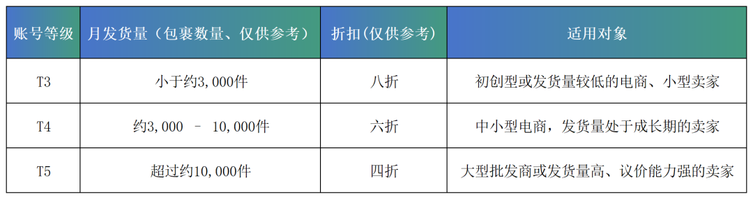 与USPS不同,UPS和FedEx并未公开推广类似“T3、T4、T5”的等级划分。它们的定价策略主要依赖于客户的发货量、运输频率以及服务需求,通过一对一定制合同来提供账号差异化折扣。